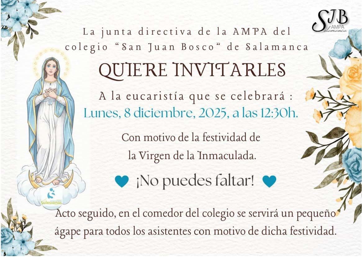 A la Eucaristía que se celebrará el lunes 8 de diciembre de 2025 a las 12:30 horas en la Capilla del Colegio con motivo de la festividad de la Virgen de la Inmaculada.